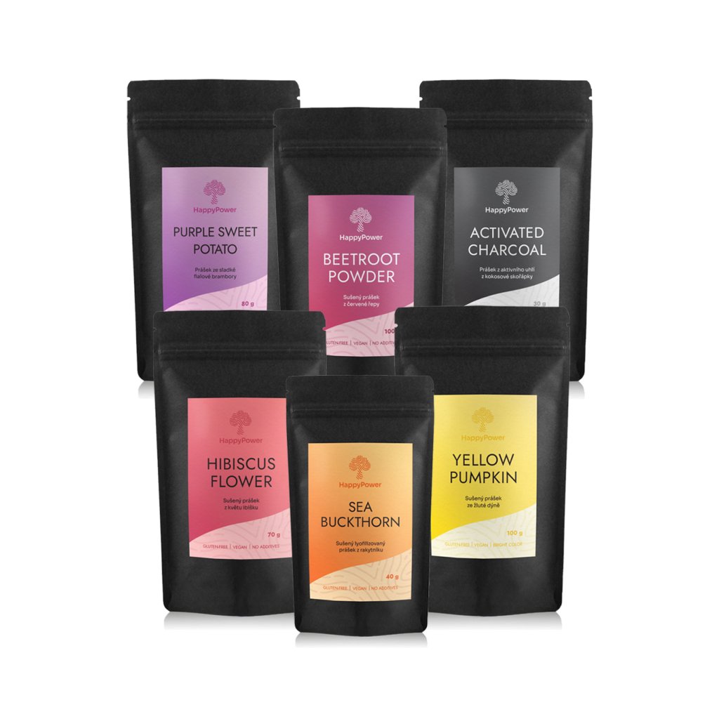 Sada do kuchyně je vybavena širokou paletou barev pro každý recept – od syté červené řepy, oranžové dýně, fialového purple sweet potato, oranžového rakytníku, tmavě červeného ibišku až po dramatické černé uhlí.